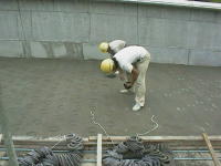 | コンクリート敷き均し後に真空マットをかぶせ、真空ポンプでコンクリート中の不必要な水分を抜くと同時に、コンクリート表面とマットの間を真空状態にします。。 これにより水和反応に不必要な水分が除去されるとともに、コンクリート面に大気圧がかかり、コンクリートの強度が最大限に発揮されるようになります。 真空マットをかける前に、すべり止め用のリング(丸型のゴムリング)を設置しておけば仕上がり面に丸型の溝ができ、すべり止め効果を発揮します。 |