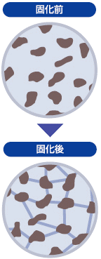 ジオセットは、土と混合すると水和反応により速やかに針状のエトリンガイト(3CaO・Al2O3・3CaSO4・32H2O)を生成します。このエトリンガイトが粘土粒子を架橋し強固な骨格を形成させ、土を迅速に固化させます。さらに、カルシウムシリケート水和物などが、この架橋をより強固なものにします。